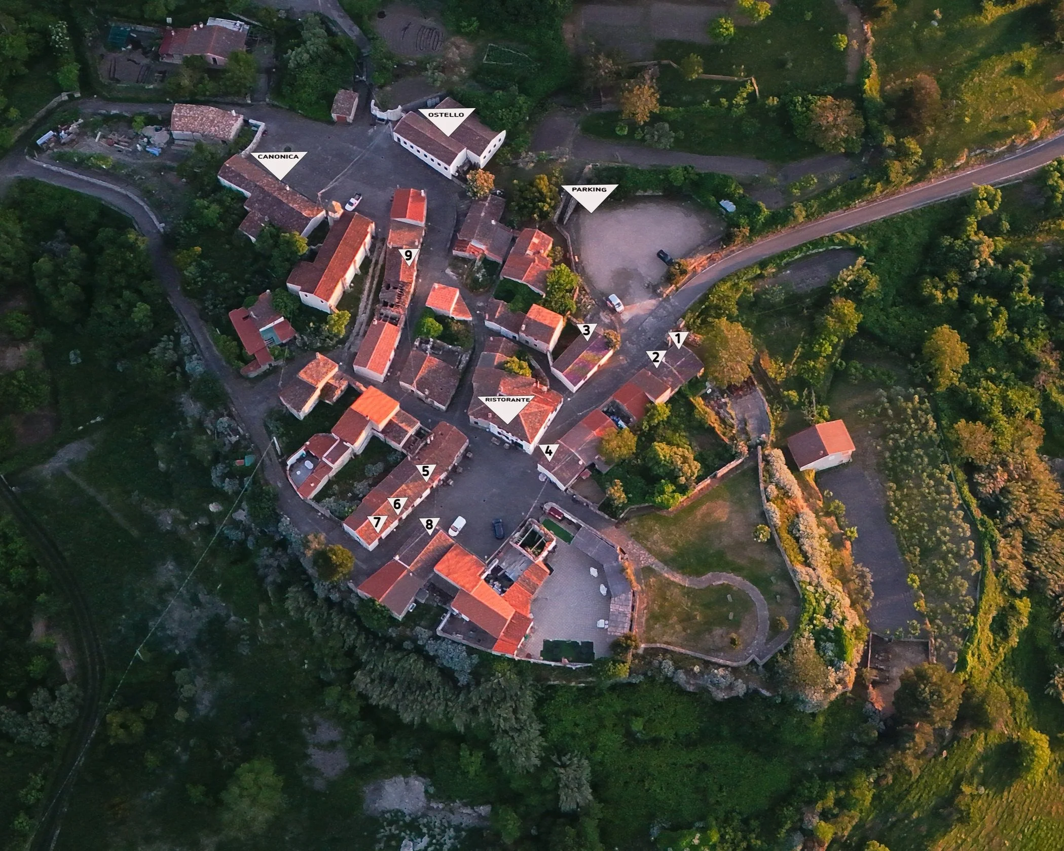 Nove casette medievali molto essenziali, uno spazio a disposizione di tutti gli ospiti con cucina e co-working, wifi, angolo caffetteria/snack self-service, book-crossing, videoproiettore, giochi da tavolo ecc.